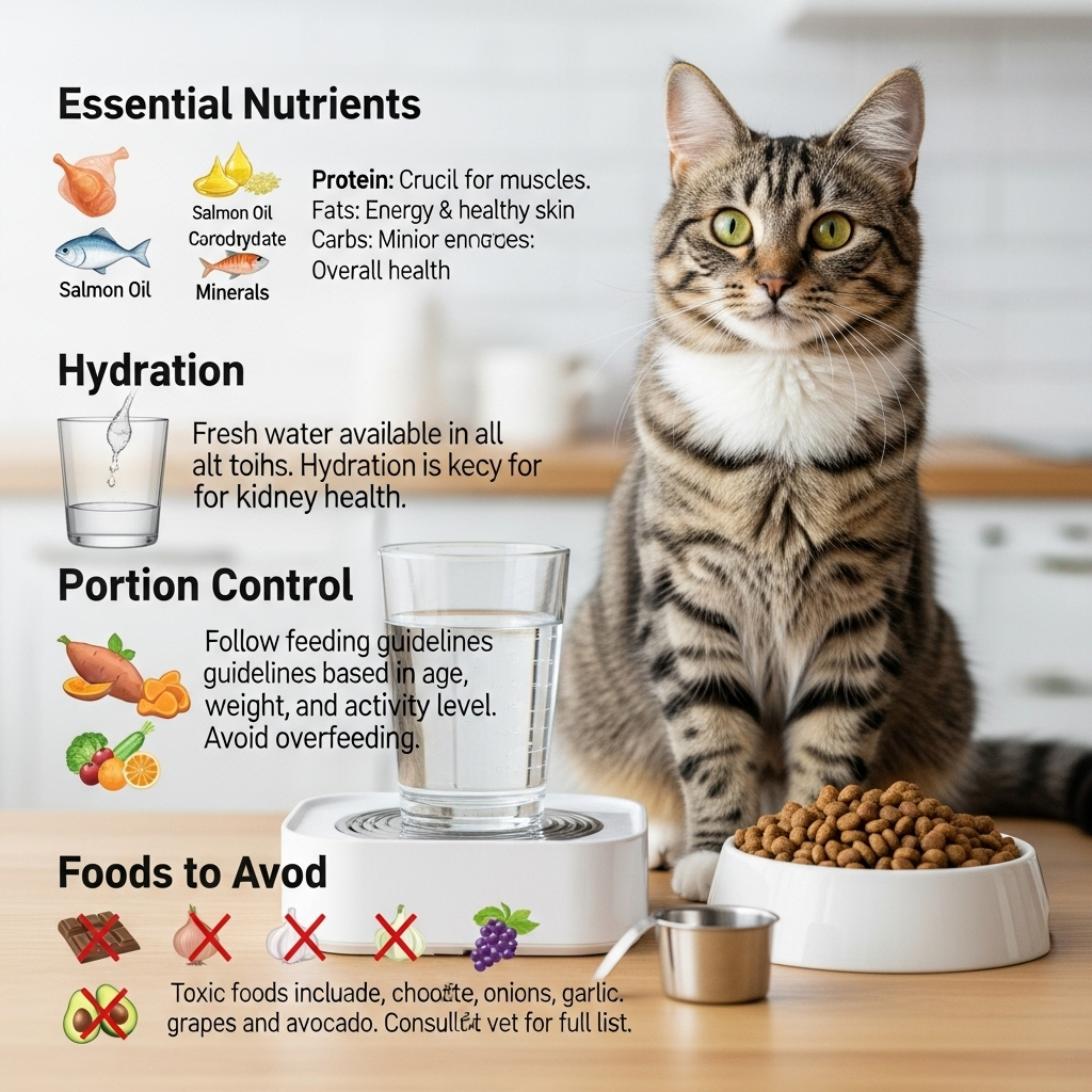 Body Condition Scoring: The World Small Animal Veterinary Association recommends regular body condition assessments. Cats should maintain an ideal body score of 4-5 on a 9-point scale, with ribs easily palpable and a visible waist when viewed from above.